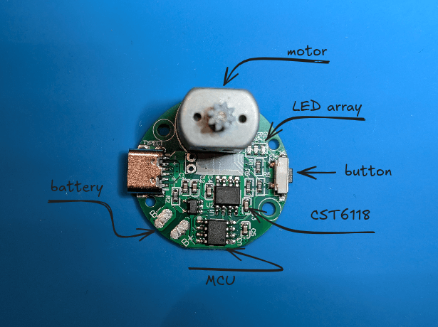 Разобрал игрушку, осмотрел — выполнена на базе неизвестного MCU (маркировка сточена) и драйвера двигателя CST6118