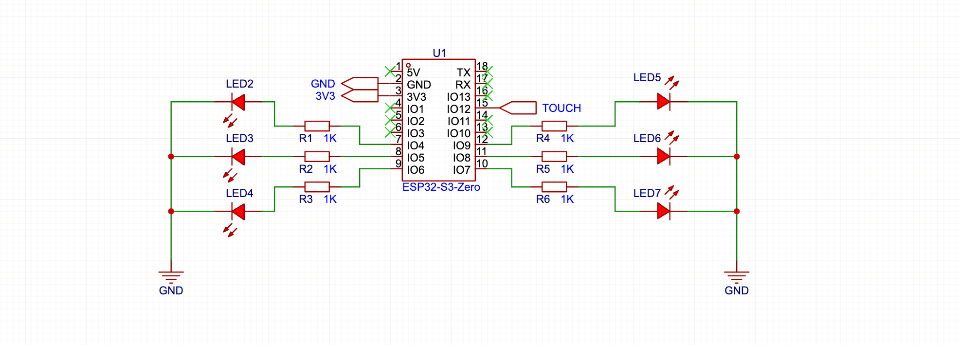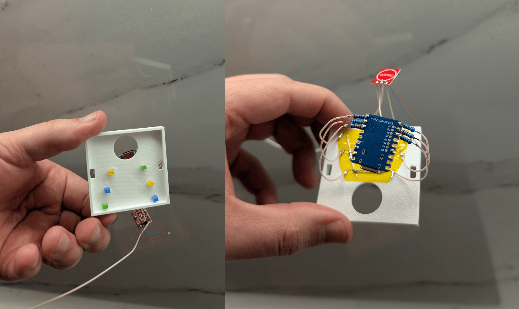 Не знаю, почему на утро я не вспомнил о встроенном в ESP32 Capacitive Touch Sensor — видимо, какое-то очередное когнитивное искажение от наличия плана :) Впрочем, это уже детали. Дальше меня снова ждал Fusion 360. Череда танцев вокруг принтера — и у меня получился такой “бутербродик” с 6+1 огоньками: