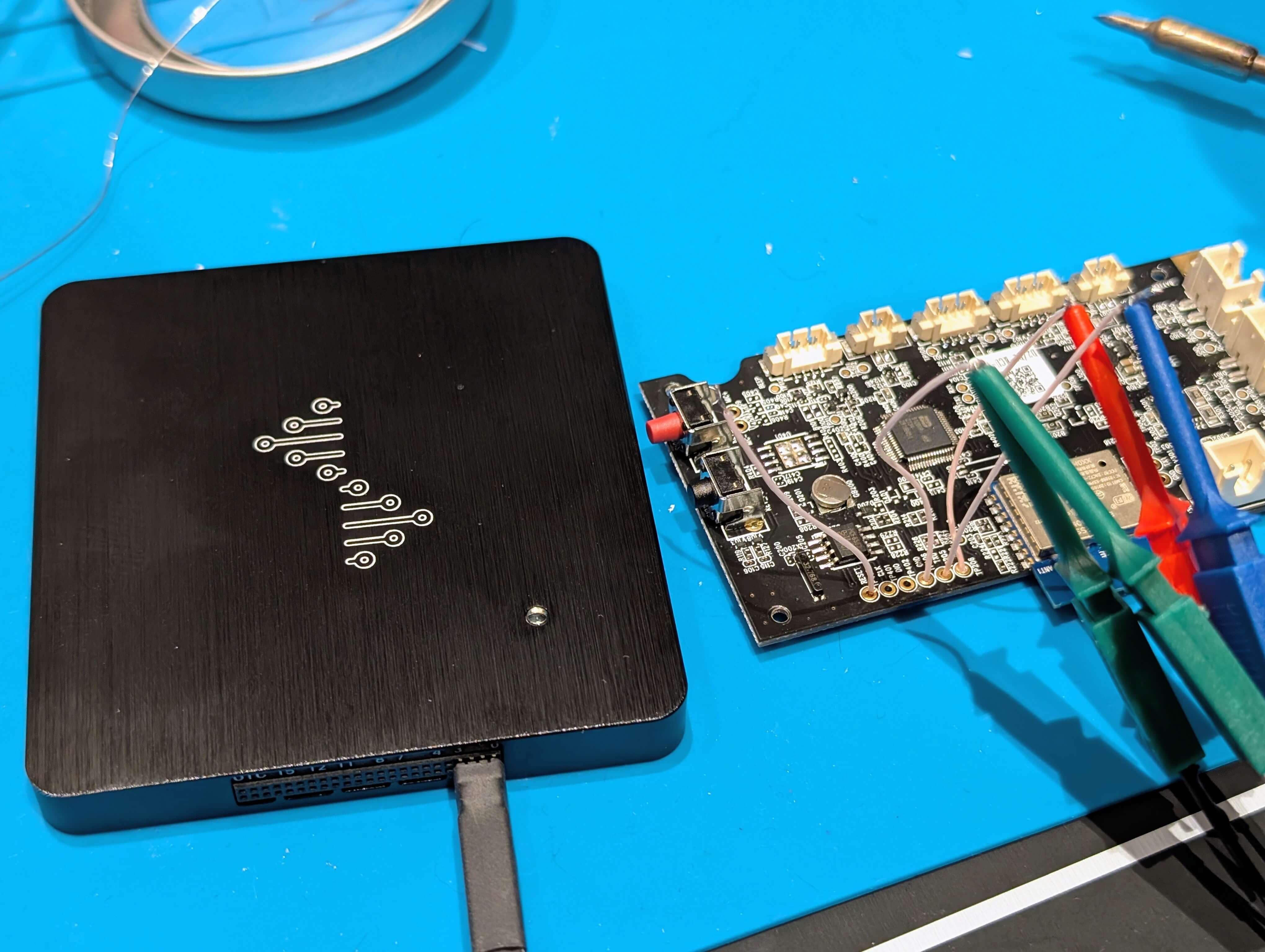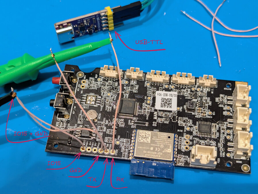 Но, прежде чем погрузиться в это великолепие, я достал паяльник, взял немного МГТФ, припаялся к важным для прошивки пинам и подключил USB-TTL (не забыв про питание от лабораторника, но это уже за кадром).
