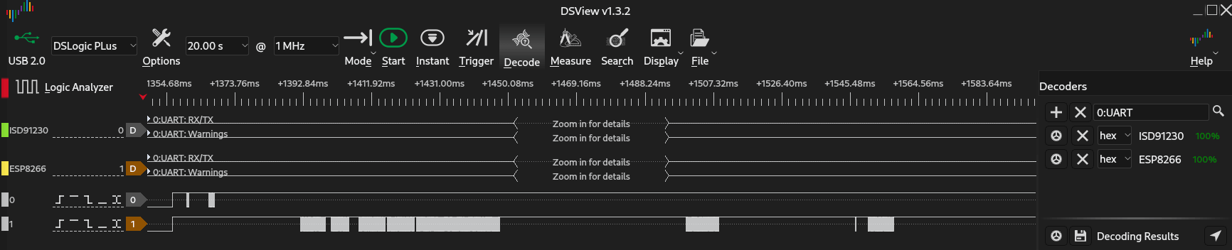 Запускаю DSView, добавляю декодер UART (115200 baud 8n1) на оба канала, и всё выглядит правдоподобно: