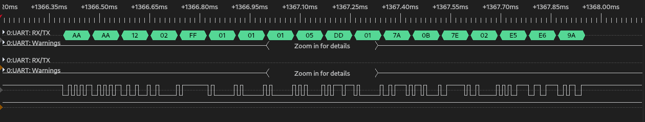 AA AA 12 02 FF 00 00 01 08 EC 02 3F 08 71 02 20 24 C5, где:AA AA— заголовок, как и в предыдущем случае07— длина пакета, как и в предыдущем случае02— тип пакета, в данном случае статусFF— порядковый номер пакета, для периодических (e.g. статуса, отправляемого раз в пару секунд) всегда равен0xFF, в остальных случаях — порядковый номер пакета запроса- опциональный