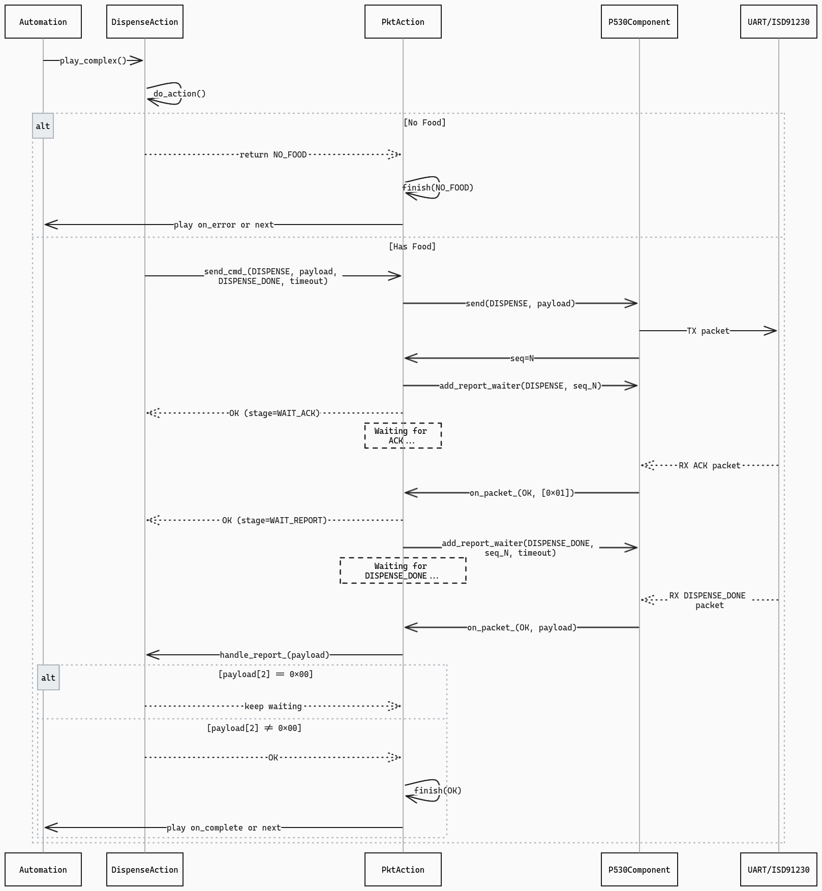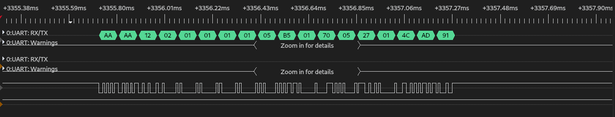 Пришла пора узнать, действительно ли ESP8266 общается с ISD91230 по UART и совпадает ли реальность с petkit-serial-bus. Автор описывает протокол так: