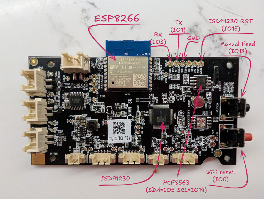 ESP8266 общается с ISD91230 по UART (как оказалось позже), а также к нему подключен RTC PCF8563 по I2C: SDA на GPIO5, SCL на GPIO14. Для визуалов: