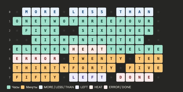 Все вордклоки, что я видел (каноничный пример: WordClock 16x16 LED matrix), похожи друг на друга: