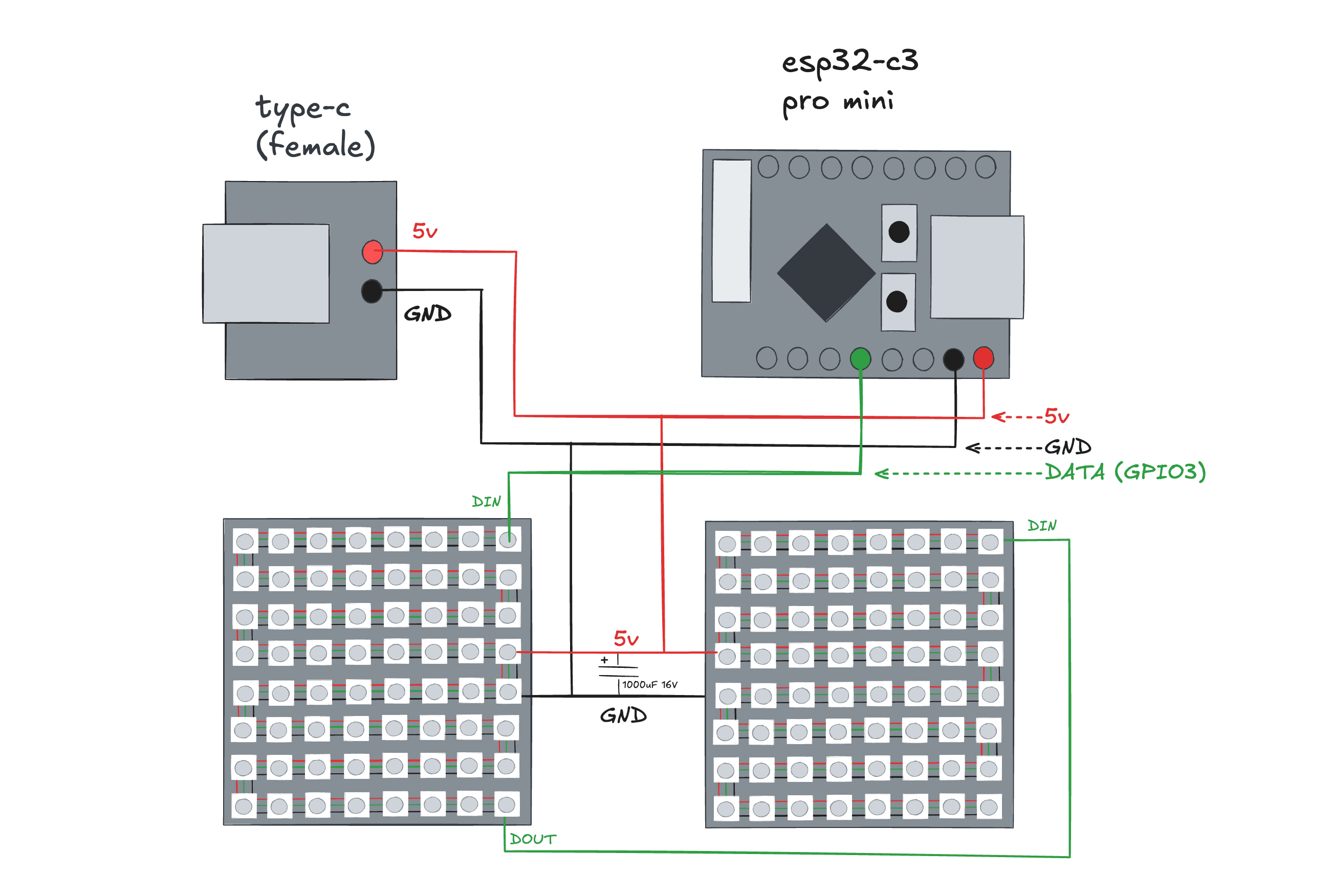 Не рискнул питать ленту через 5V-линию борда, потому воткнул отдельный type-c разъем, а уже от него отдельной линией 5V на MCU и отдельной на ленту со своим bulk-конденсатором. Data-линию ленты, недолго думая, подключил к GPIO3 ESP32-C3.
